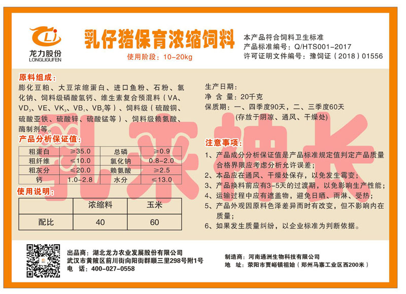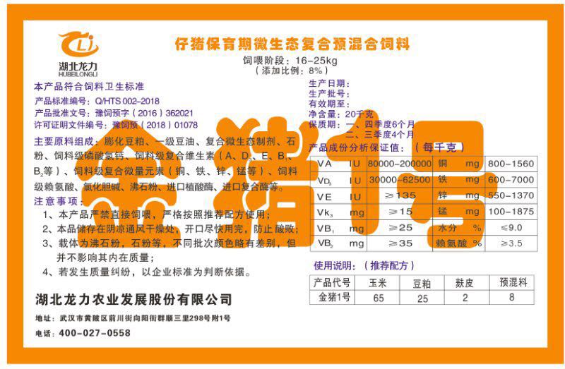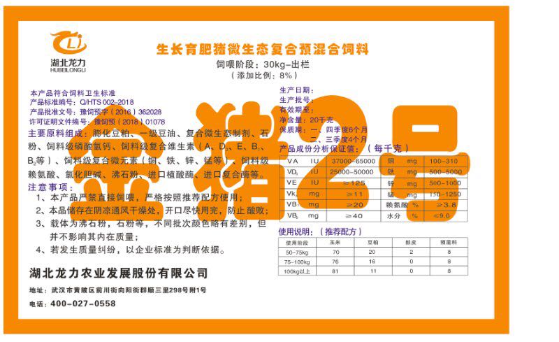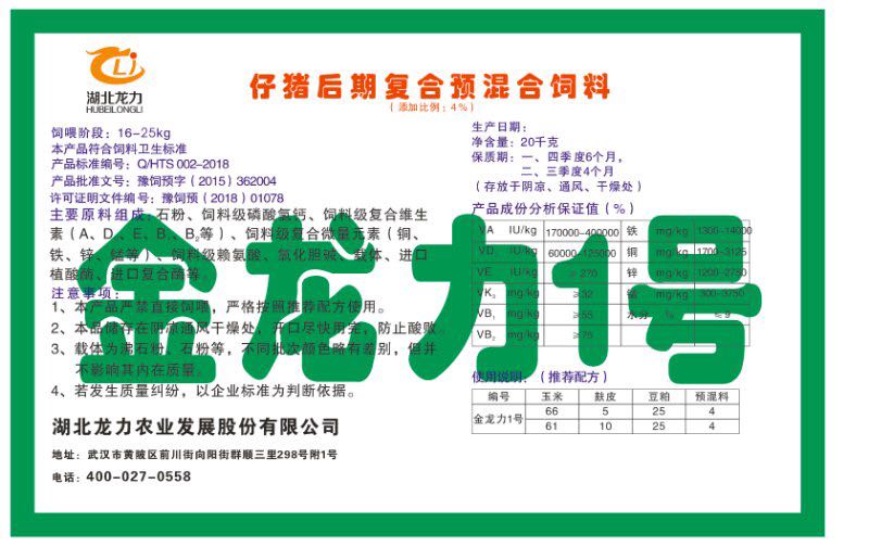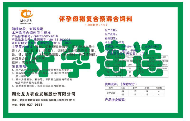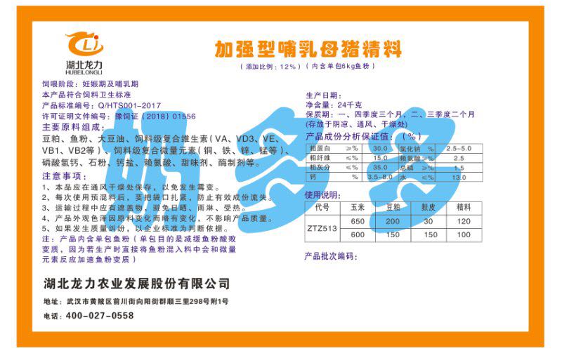湖北龍力農(nóng)業(yè)發(fā)展股份有限公司坐落于武漢市黃陂區(qū)前川街向陽街群順三里298號附1號。公司成立于2014年6月,公司自成立以來把“創(chuàng)全球最大養(yǎng)豬綜合服務”為企業(yè)愿景。致力于打造教保料品牌”作為公司發(fā)展的明確目標。公司一直致力于豬營養(yǎng)的研究和開發(fā),積極與國內(nèi)外高校和科研機構合作,推廣養(yǎng)豬技術、動物營養(yǎng)新概念,向世界農(nóng)牧企業(yè)學習與合作。公司采用國內(nèi)先進的生產(chǎn)工藝,選擇高精度電子配料秤,高均勻度、無殘留混合機等先進設備....